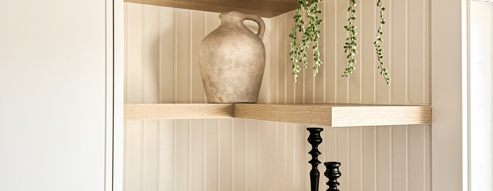 Sherman was a really exciting project for me. I connect with all of my projects but this one just touched me in a different way. A Design Detail that brought me so much joy and that I couldn't wait to see installed was the combination of the backsplash and the beadboard. But don't fret, those weren't the only details that that went into this Kitchen Renovation. We did contrasting cabinets, a wood island, a plaster range hood and even mixed metals while incorporating a feature wall for warmth and interest. Everywhere you look in this kitchen there is a detail that truly just catches your eye. As far as layout, we kept the layout of the plumbing and electrical the same - they were in great locations and worked with the new layout. We also added in pot lights while utilizing the locations of the existing light fixtures to alleviate any ceiling repairs. We closed in the oak cabinetry display on the hallway wall and instead turned this into a focal point. Lastly, we installed new flooring throughout most of the main floor to compliment the new kitchen.